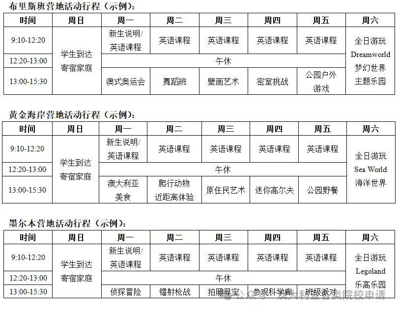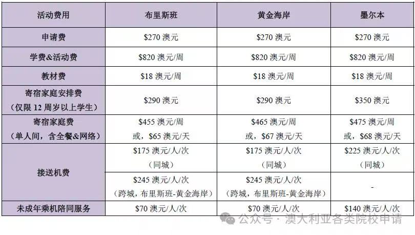 寒假游学营学习和活动费用每周约820澳元,寄宿家庭为每周约460澳元,接送机不同机场会有不同的报价,约在每次200澳元左右。学校报名费每次270澳元,寄宿家庭报名费每次290澳元和每周资料费20澳元等费用皆为学校收取,最终的费用以学校出具的录取通知书为准。